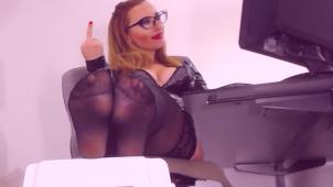 La tua segretaria porca vuole che tu mangi il tuo sperma per lei oggi, per le sue calde gambe abbronzate con i tacchi rossi, il suo culo lucido in lattice, la sua scollatura molto profonda, il suo corpo sexy e sinuoso. Ti stuzzica con le sue gambe lunghe e sexy e il suo culo grosso mentre controlla il processo di sega, ora è lei a comandare con te. Lei ordina: tu obbedisci, come una brava cagna obbediente!