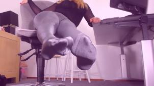 Ti stuzzico con le mie gambe di nylon e il mio piede di nylon mentre mi masturbo la mia figa di nylon bagnata. Puoi vedere una macchia bagnata proprio sul cavallo dei miei collant mentre mi tocco.