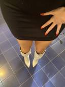 Indosso un paio di collant bianchi senza cuciture, una gonna in lattice lucido, una camicetta di raso bianco e tacchi alti enormi da 10 pollici (tacchi aperti in punta, sabot con plateau).