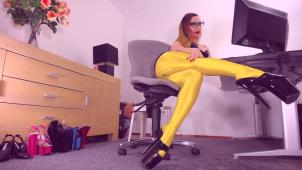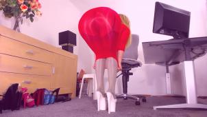 When you come to my office, you find me sitting on my office chair in front of computer with my crossed legs in stockings. You can not stop looking at my sexy red patent pumps with a stiletto heel, sexy office shoes with gold heels. Those heels look so sexy when I dangle them, heels dangling makes you horny so quick. You look at my sexy legs in nylons and suddenly you see I have something weird between my legs. What can it be? Strap on!
